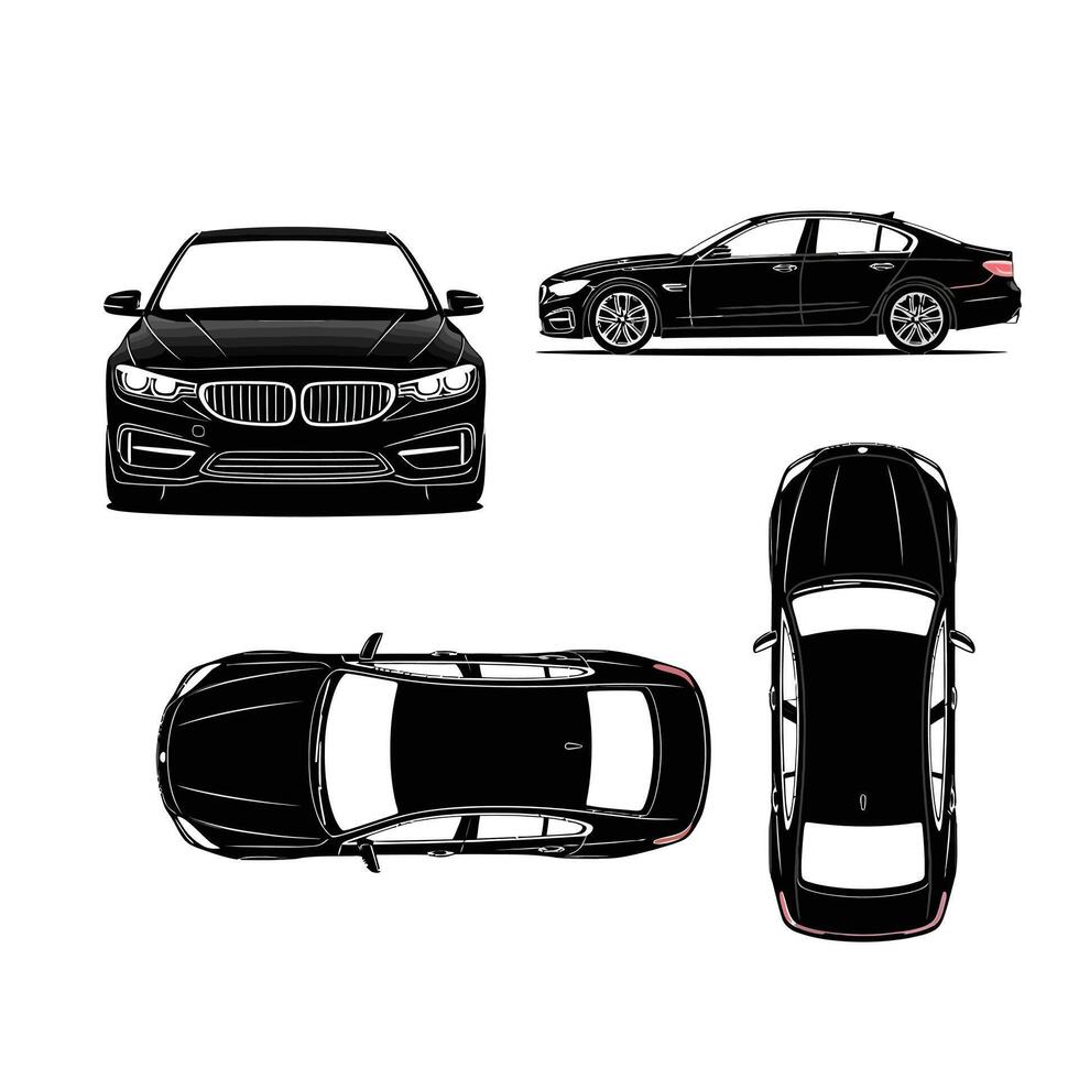 Set of black car illustrations showing front, side, and top views for design and presentation purposes Pro Vector