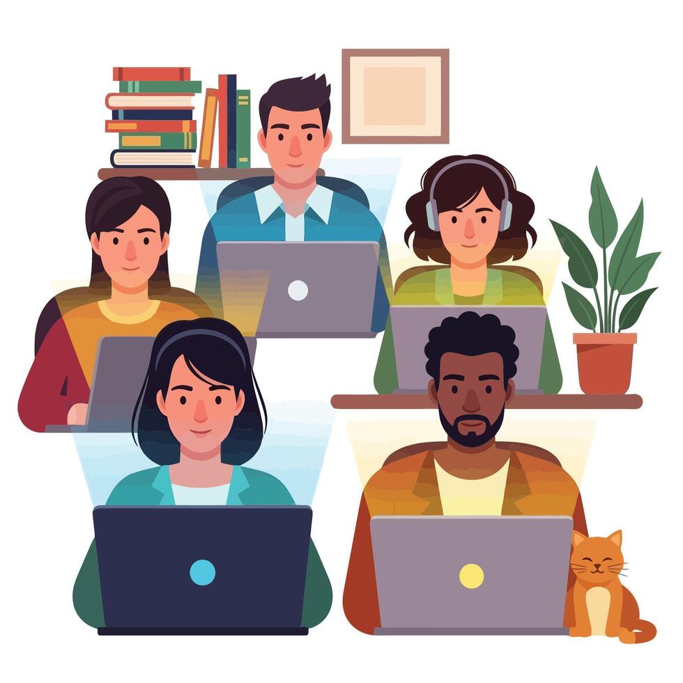Diverse team collaborating online remotely using laptops, vibrant workspace Pro Vector