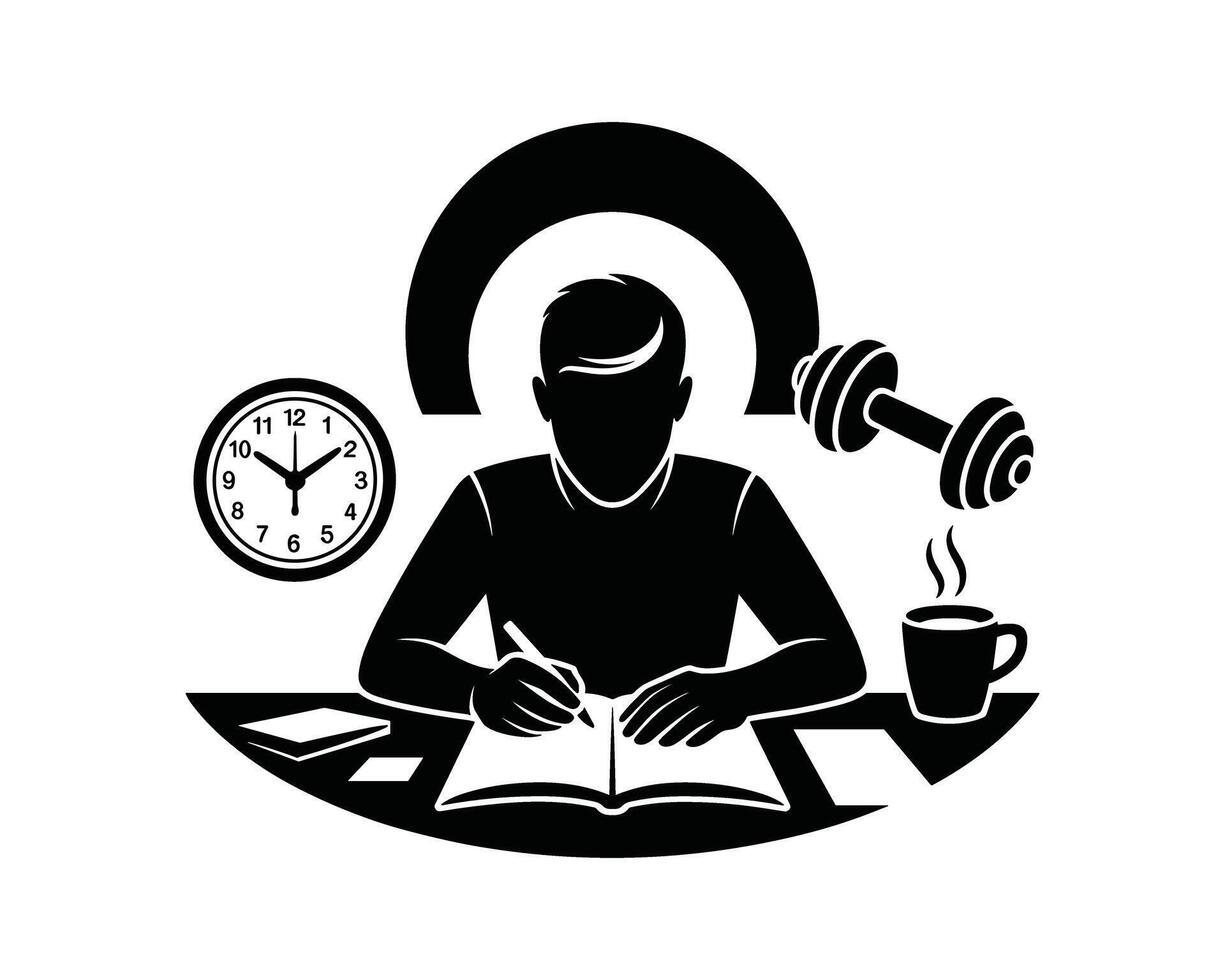 Silhouette of a person studying at a desk with a clock dumbbell and coffee cup symbolizing balance and dedication vector