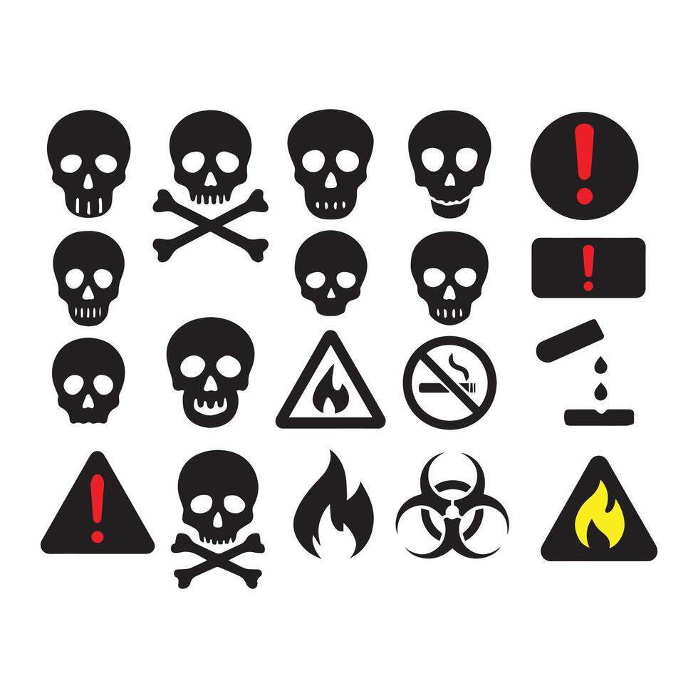 Set of Danger Symbols and Warning Icons representing hazards, toxicity, and biohazards, isolated on a white background for safety communication Pro Vector