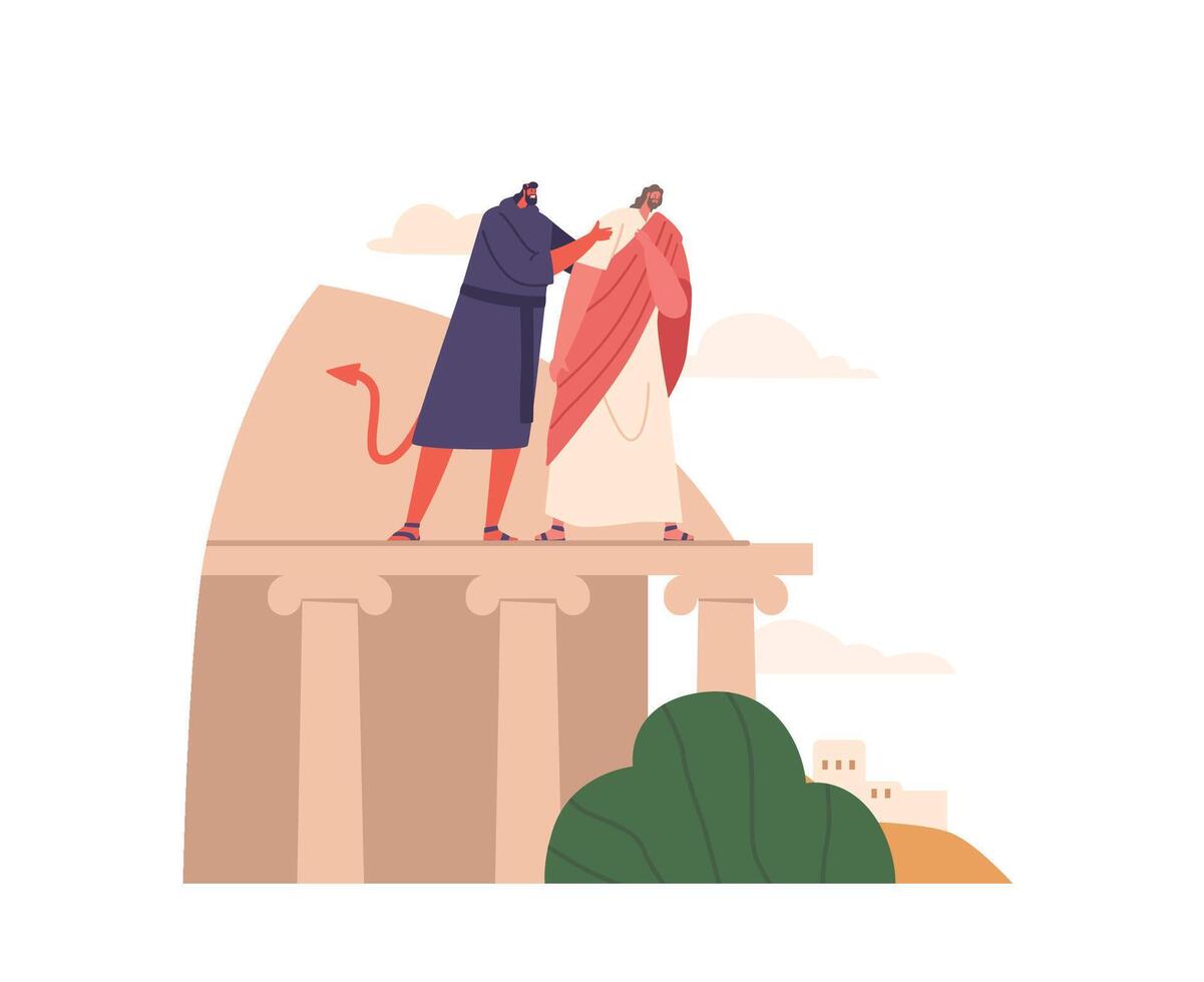 Jesus Resists The Devil Temptation To Jump Off The Temple, Relying On Scripture And Faith Instead Of Devil's Persuasion Pro Vector
