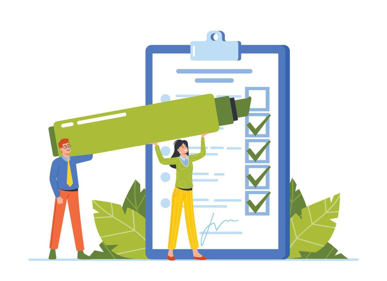 Tiny Male and Female Characters Fill Questionnaire Form with Huge Highlighter Putting Tick Marks into Boxes Pro Vector