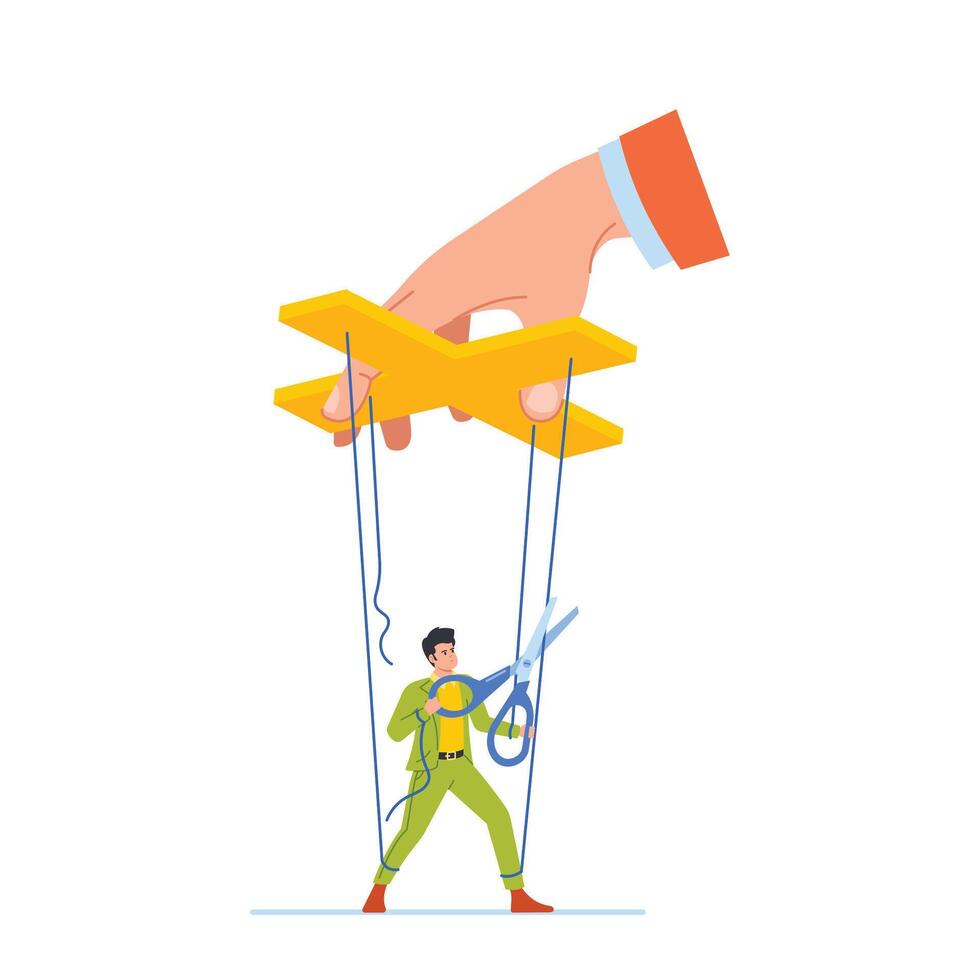 Marionette Employee Male Character Deftly Cuts Ropes, Freeing From Strings, Symbolizing Independence And Freedom Pro Vector