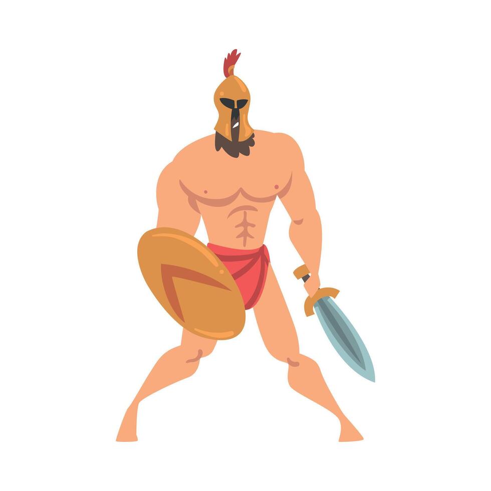 Spartan Man in Helmet Armed with Sword and Shield Attacking Illustration Pro Vector