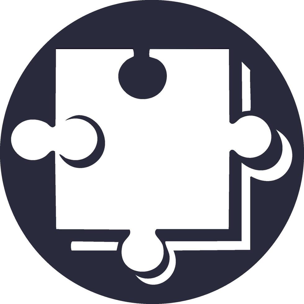 Abstract white jigsaw puzzle piece icon within a dark round frame symbolizing connection and solution Pro Vector
