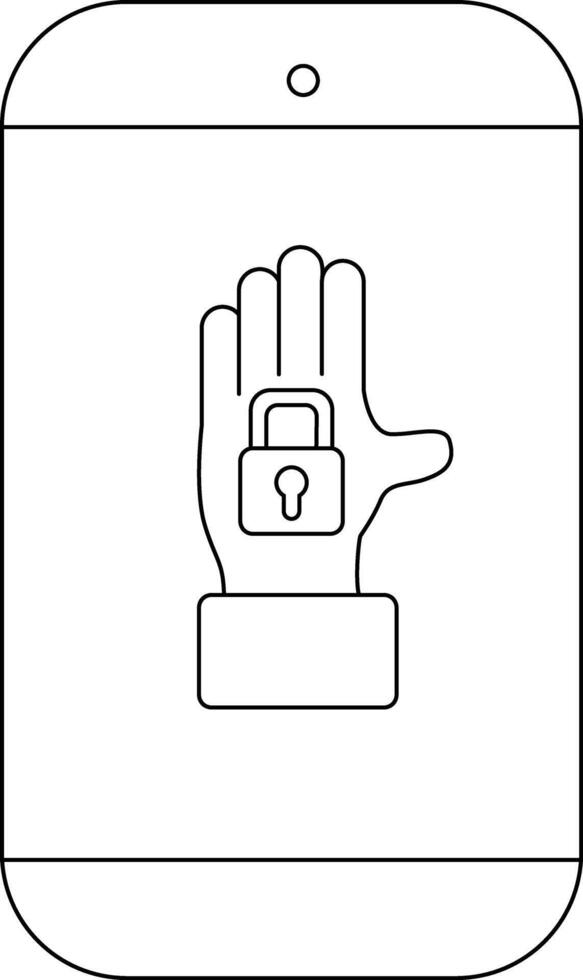 An outline drawing of a smartphone screen displaying a hand with a lock icon vector
