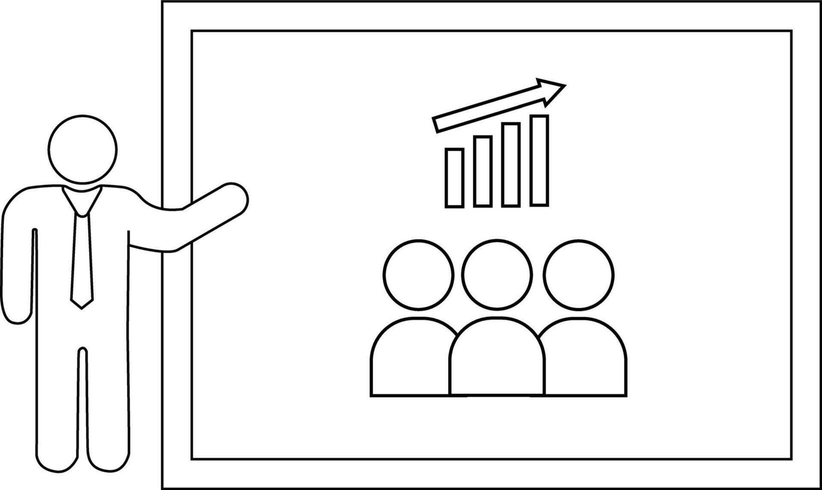 A presenter stands beside a whiteboard featuring a bar graph arrow and three people vector