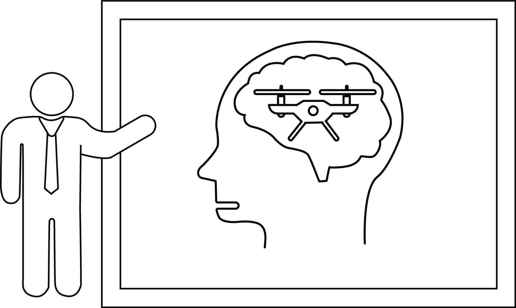 Man presenting brain with drone inside on screen Simple black and white line drawing vector