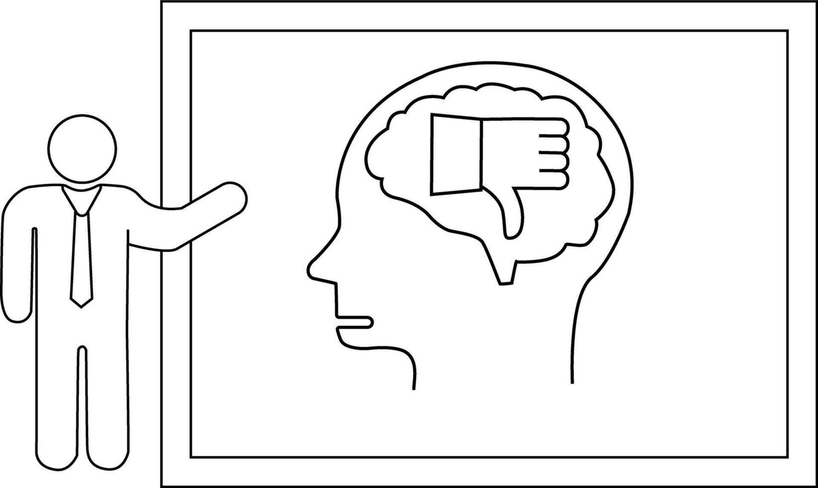 Man presents a negative idea head profile with thumbsdown hand inside a brain on a whiteboard Free Vector