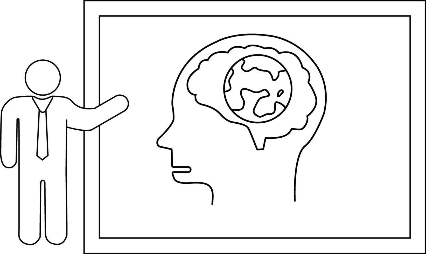 Presentation with a man gesturing to a whiteboard On the board is a head profile with a globe inside of the brain vector