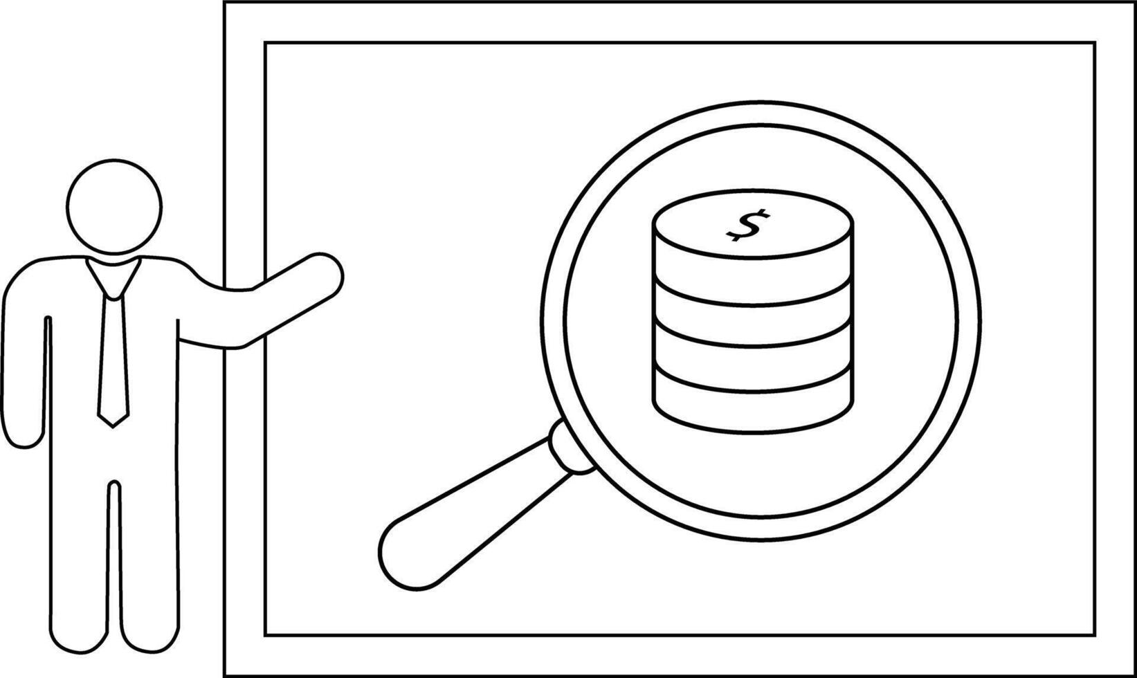 An outline image shows a person presenting a stack of coins magnified on a screen vector