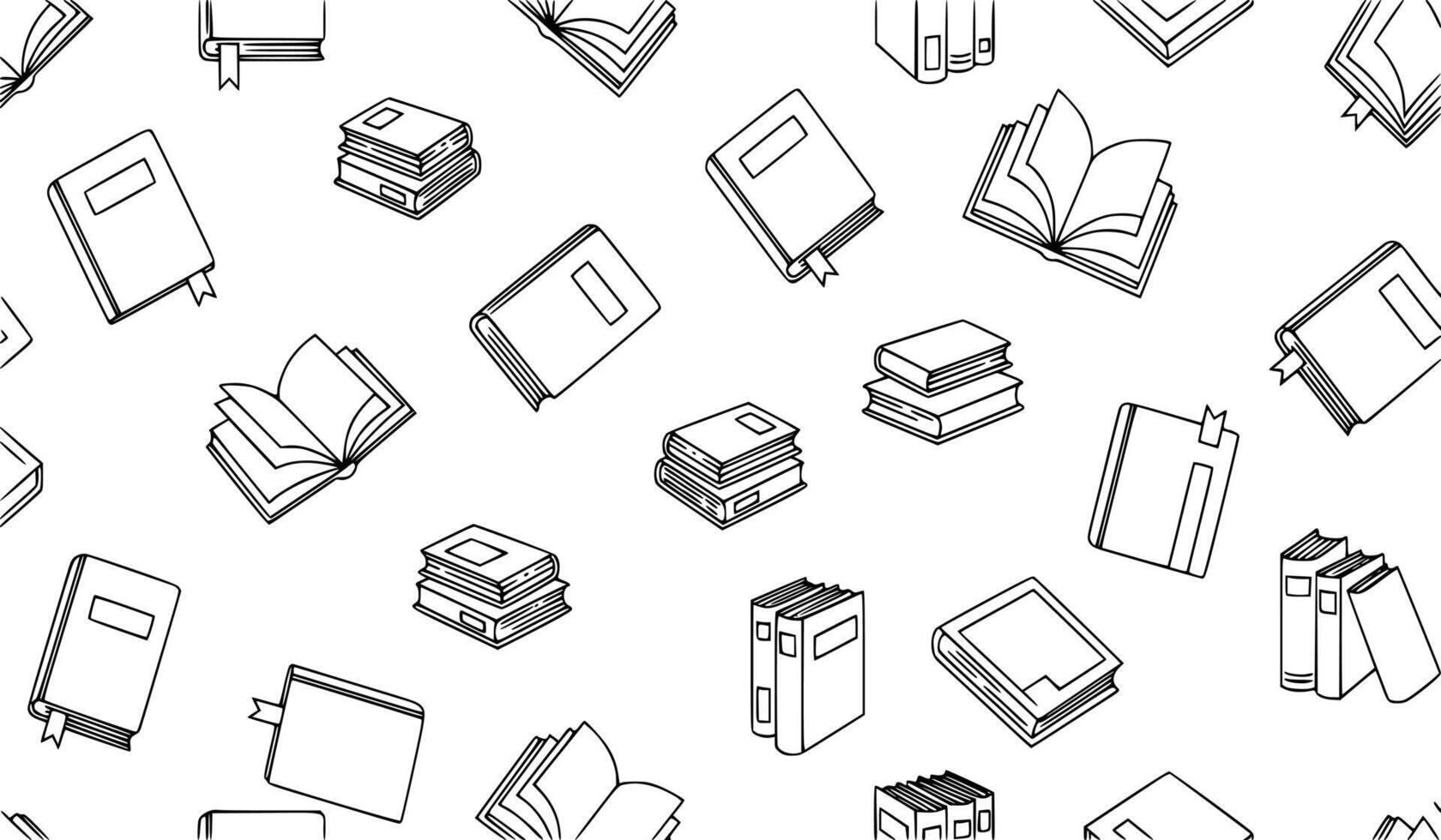 Black and white book outlines form a seamless pattern symbolizing reading, education, knowledge, and study. Pro Vector