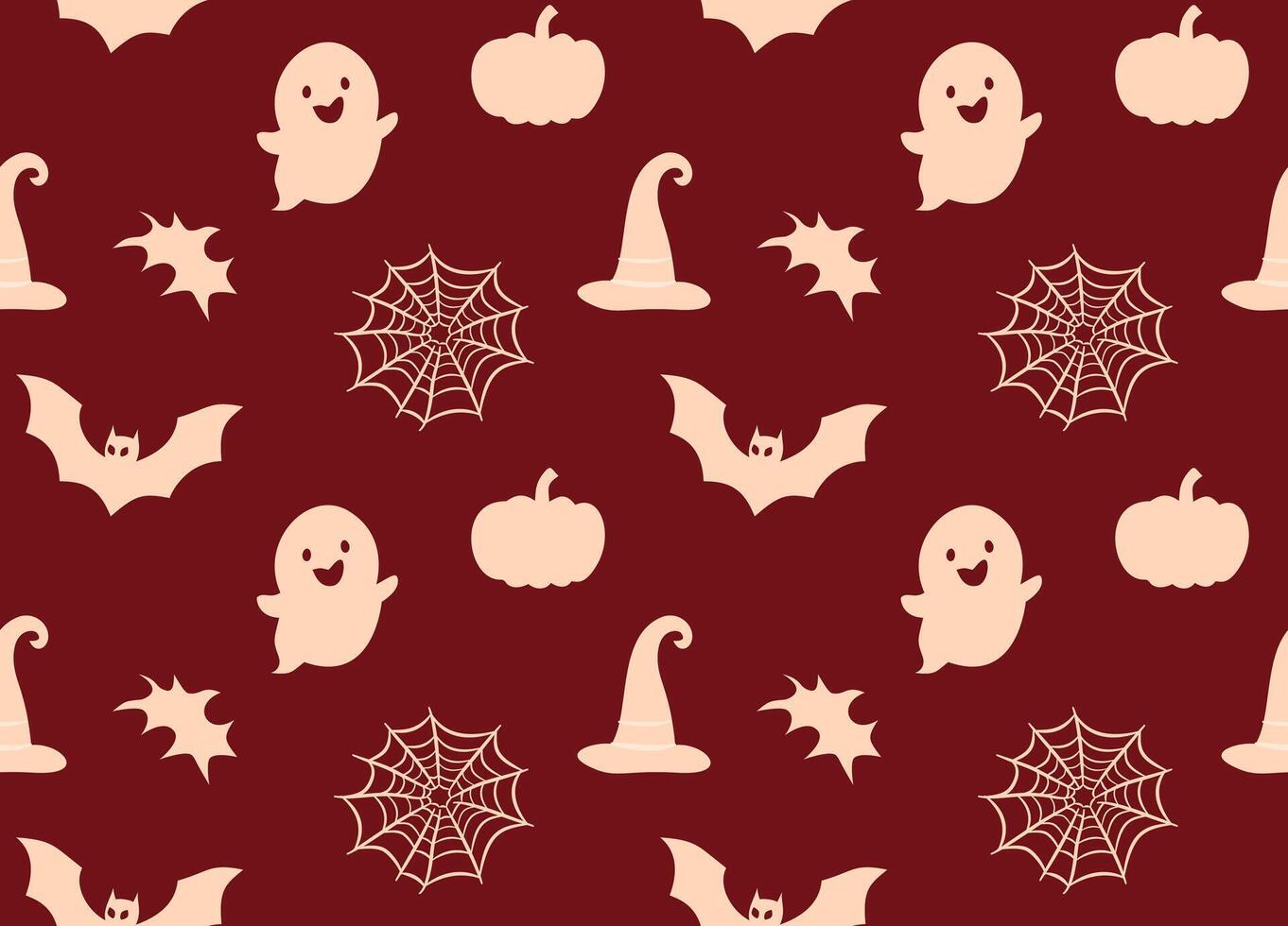 Seamless Halloween pattern with pumpkins, bats, ghosts, spider webs, and witch hats. Repeated spooky design on red background. Pro Vector