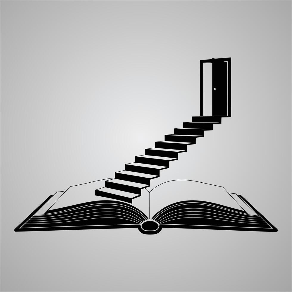 Open book with black stairs leading to an open door against a gradient gray background staircase Pro Vector