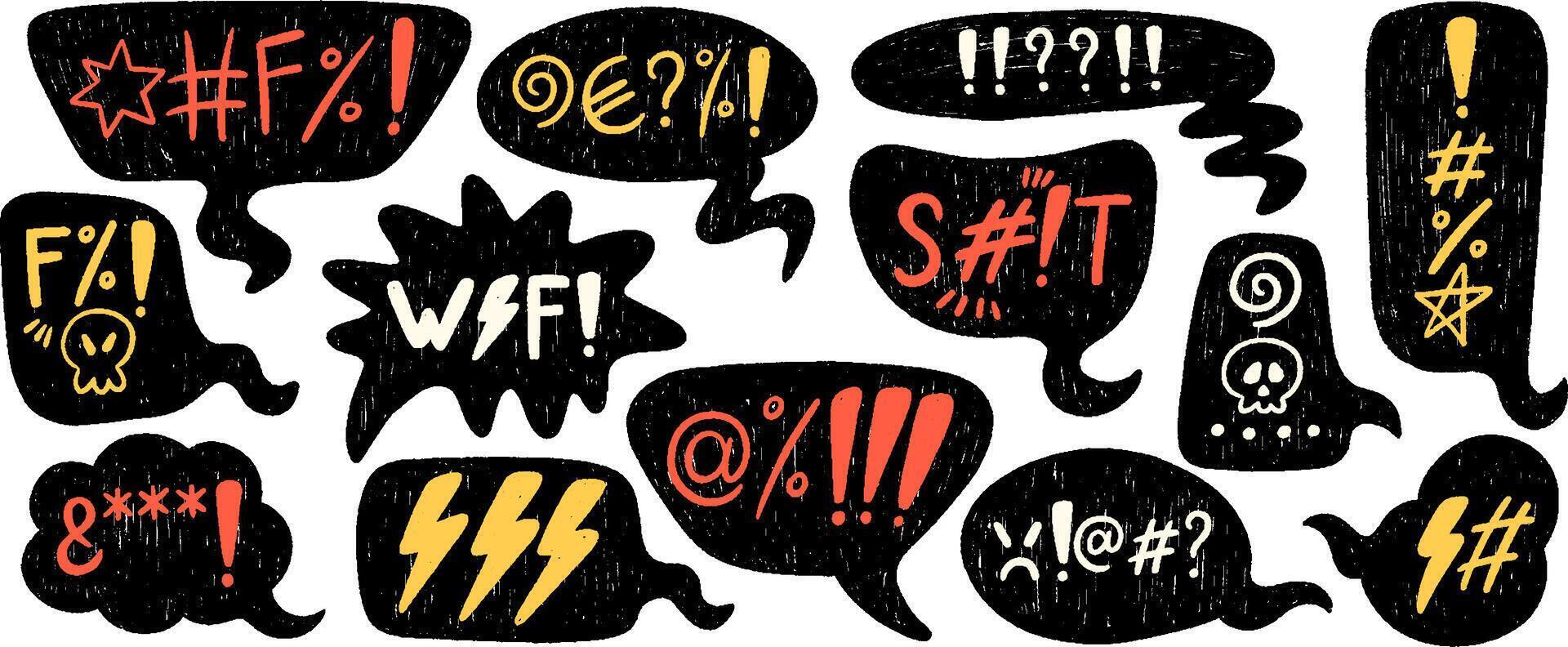 Hand drawn crayon speech bubbles with swear words. Chalk pencil communication frames with curses, skull icon, censored with symbols in crayon grunge style for negative expression, angry or bad mood. Pro Vector