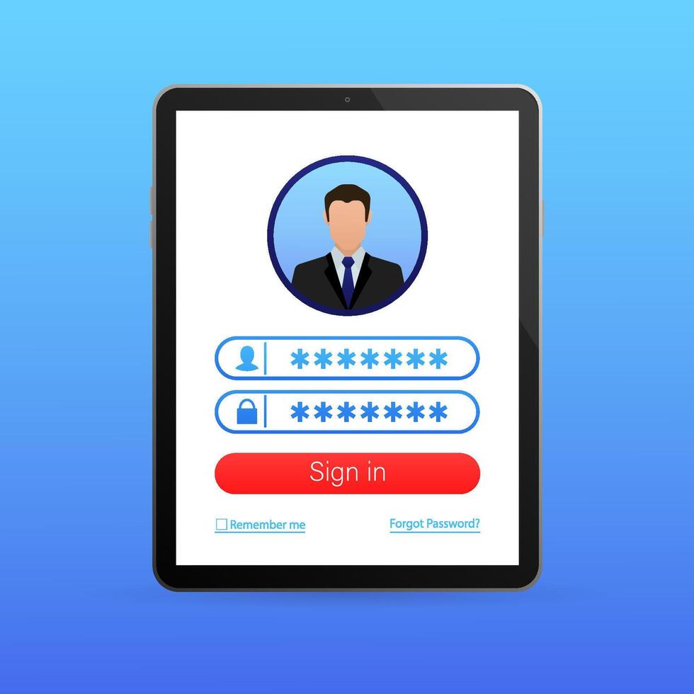Log in tablet hands, great design for any purposes. illustration flat design. Laptop screen. Phone icon . Cartoon button with log in tablet hands. Pro Vector
