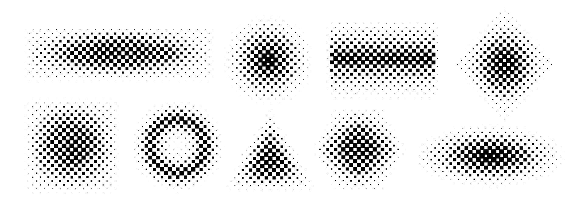 Gradient halftone shape set. Dotted textured round, square, rectangle patterns. Cartoon faded background collection. Pixel bitmap element pack for frame, poster, collage, banner. Comic bundle Pro Vector