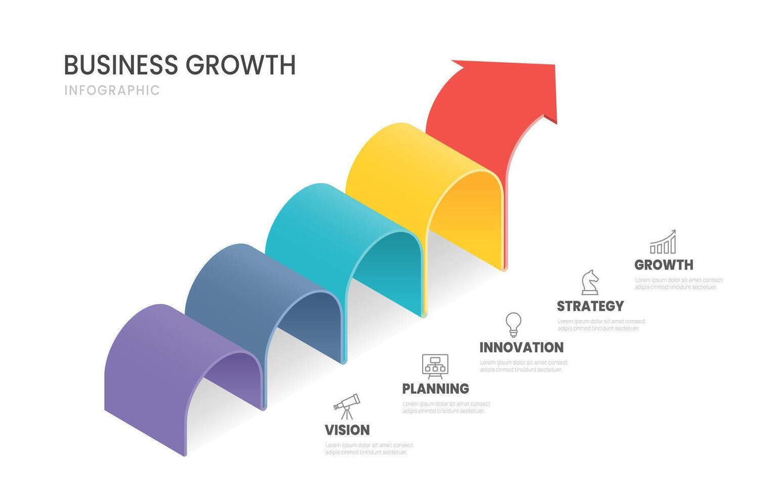 Growth infographic business arrow chart template 5 steps, presentation with venn diagram elements illustration. Pro Vector