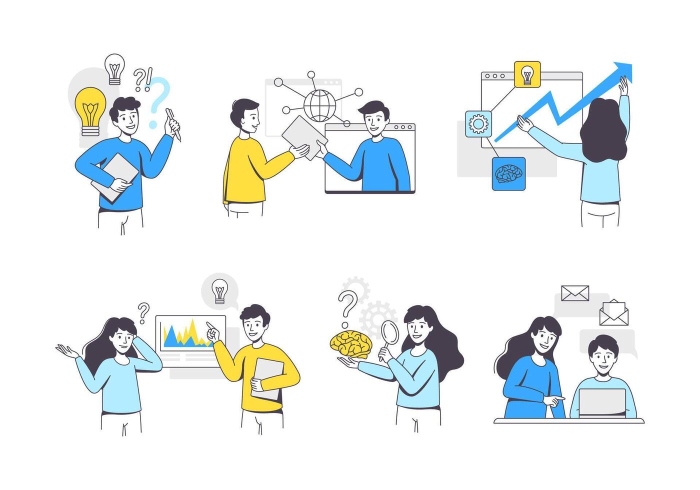 Business Project with People Character with Brain and Lightbulb Working with Startup Outline Set Pro Vector