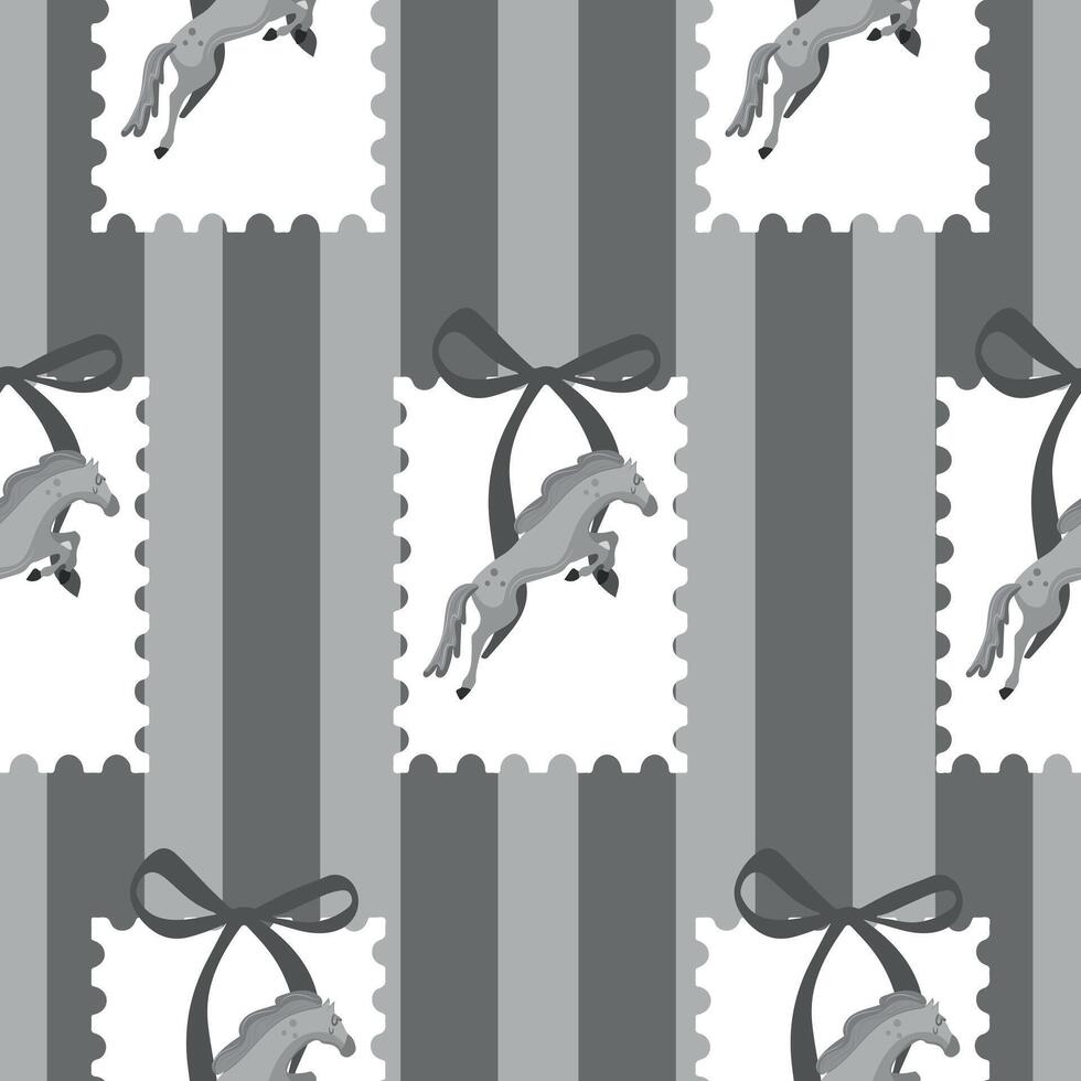 festive seamless pattern with a gray horse in a jumping moment with bows on a gray background with gray lines behind, for textiles, packaging or greeting cards Pro Vector