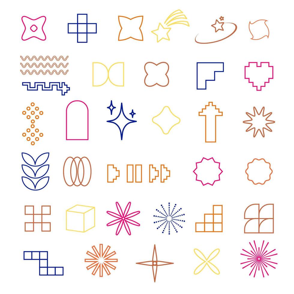 Abstract geometric line icons stars, cubes, arrows, spirals, flowers, hearts, and shapes in retro Memphis style for digital design, branding, web UI, presentations, posters, creative projects. Pro Vector