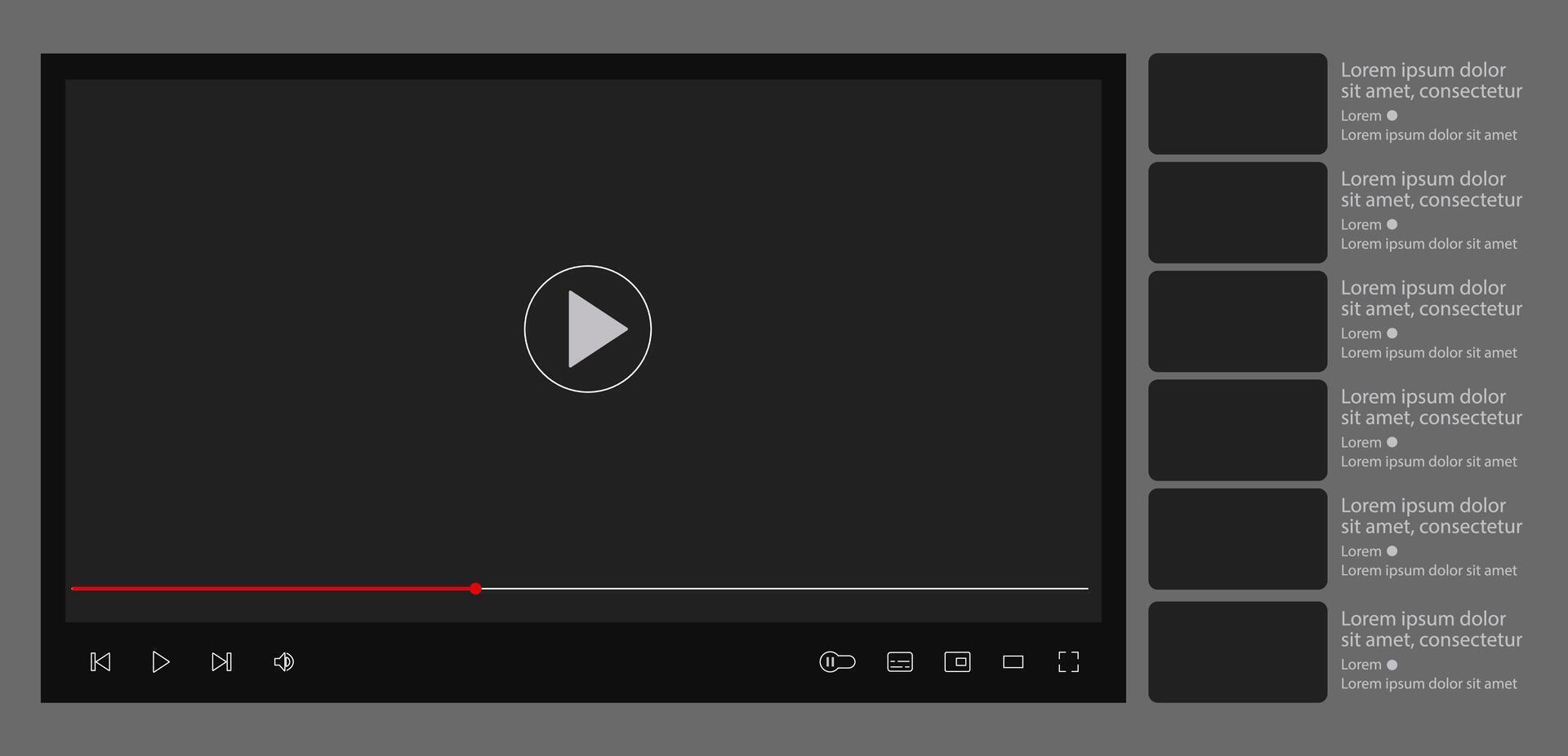Multimedia player with play button, play window with navigation icons, streaming frame on internet, modern social media player interface template live digital stream Pro Vector