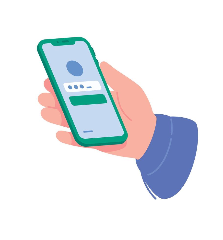 Illustration of a hand holding a smartphone. The application interface on the phone screen. Log in to your personal account. Image for design projects, website and printing, mockup design. Pro Vector