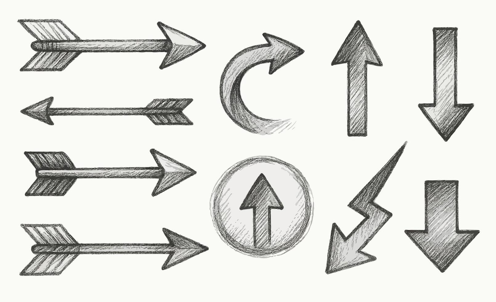 Symbol Set Hand Drawn icon arrows And cursor Illustration In Engraving Style, scribble, strokes. Black And White Seamless Sketchy arrow Elements, Line art, Pattern Sketch Style Isolated. Pro Vector