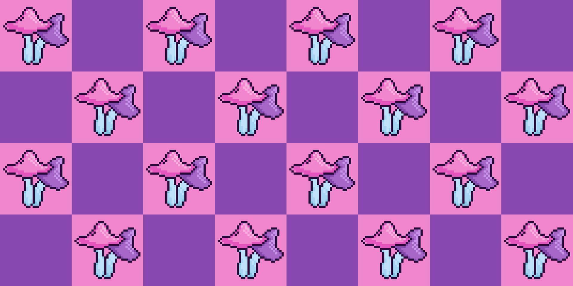 Seamless pixel art pattern with pink and purple mushrooms on a checkered background. Nostalgic 8-bit style. For fantasy, gaming, Halloween, and magic projects. Horror, retro style, old arcade game. Pro Vector