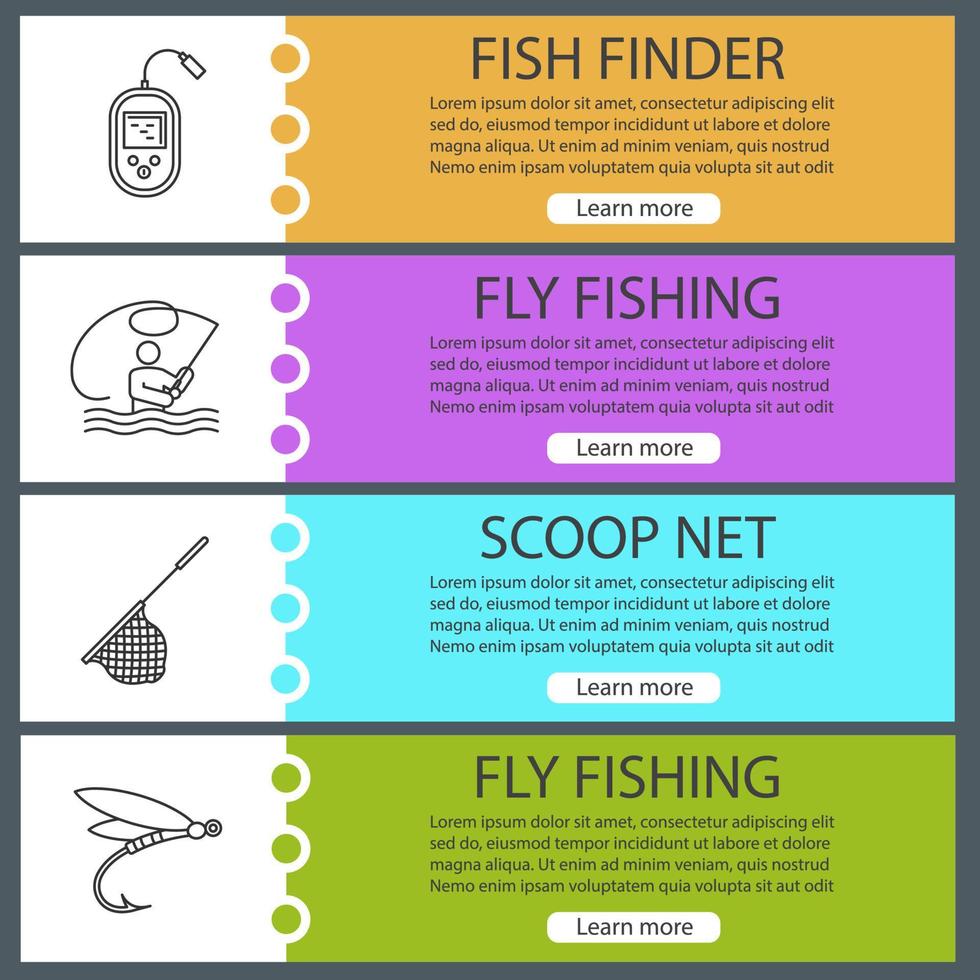 Fishing web banner templates set. Fly fishing, echo sounder, landing net, insect lure. Website menu items. Vector headers design concepts Pro Vector