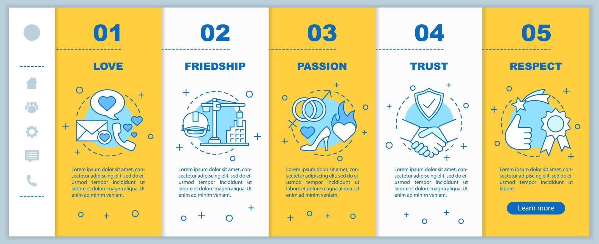 Relationships and feelings onboarding mobile app page screen vector template. Love, friendship, passion walkthrough website steps with linear illustrations. UX, UI, GUI smartphone interface concept Pro Vector