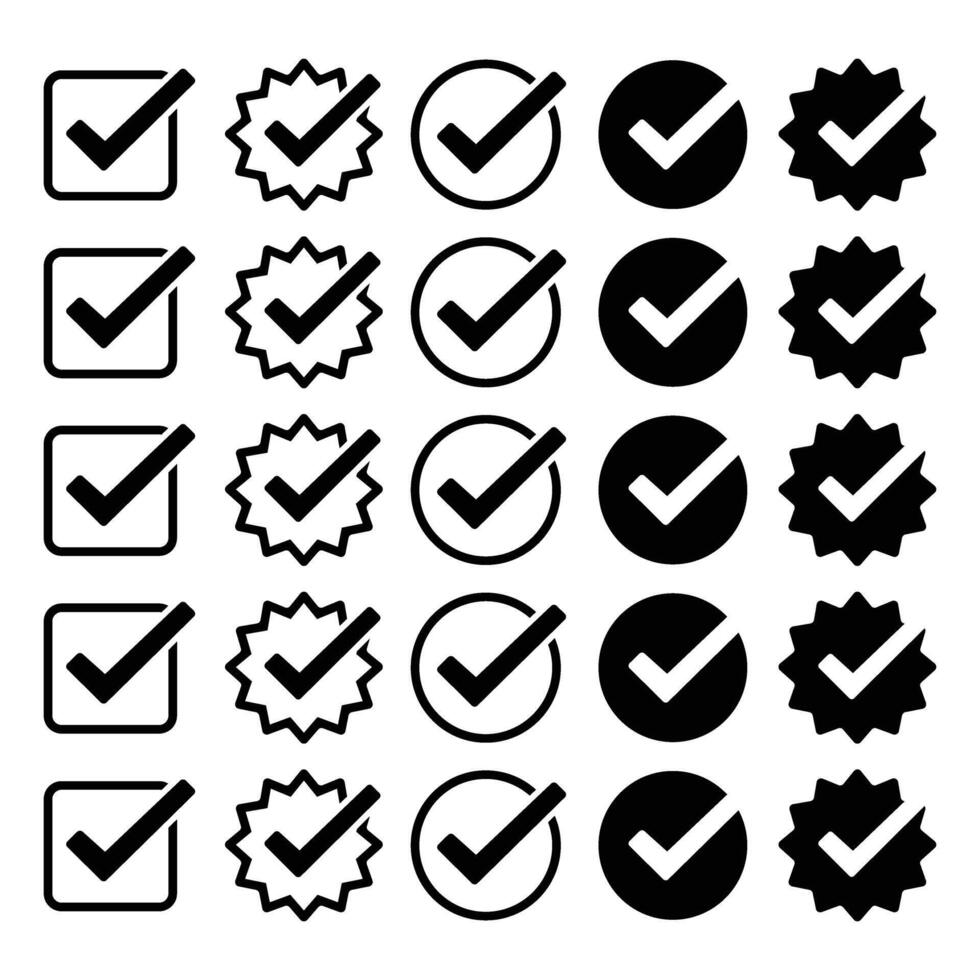 Various check mark icons in square, circle, and star shapes are arranged on white background Pro Vector