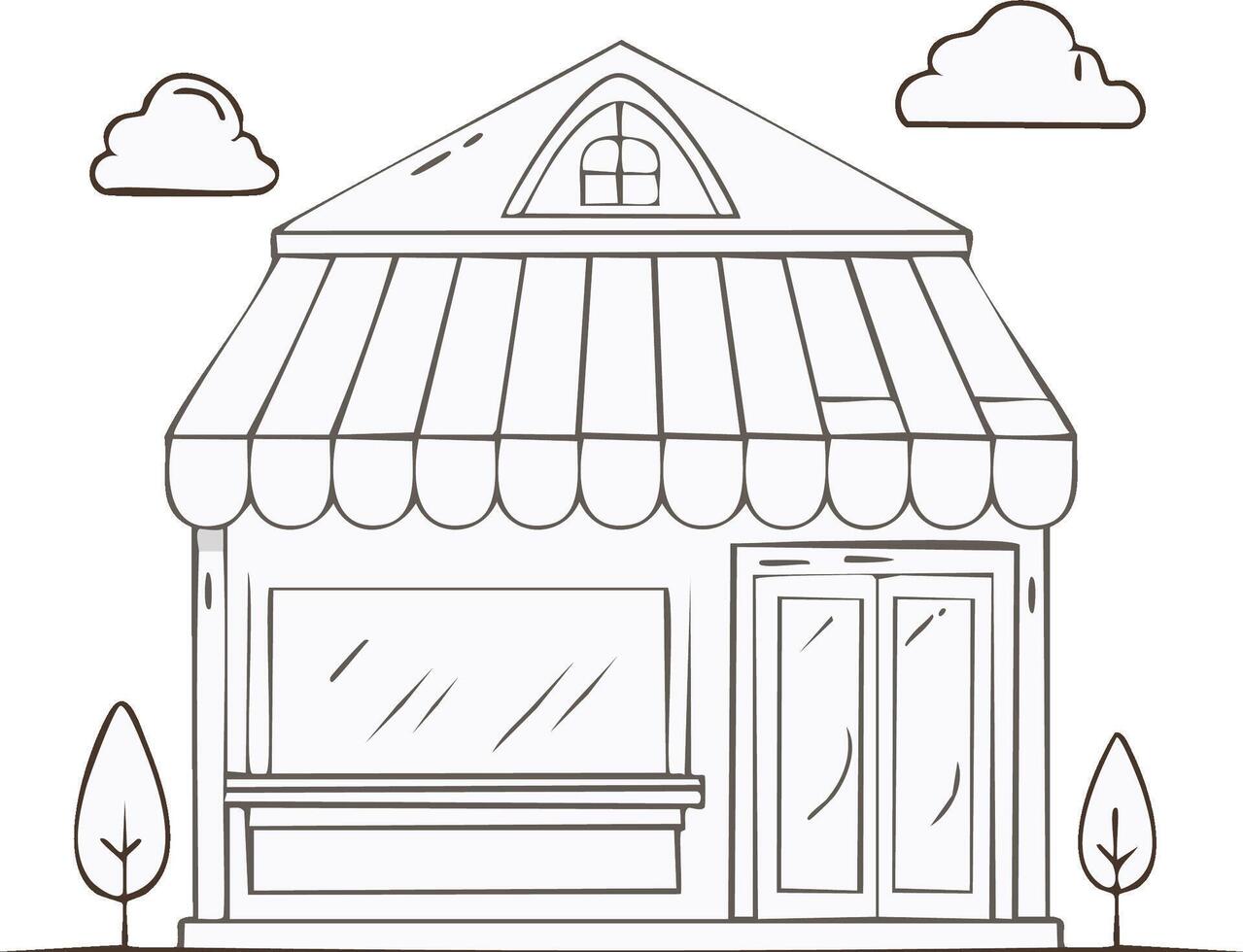 Charming small shop building simple line art with a striped awning display window entrance door fluffy clouds and trees Pro Vector