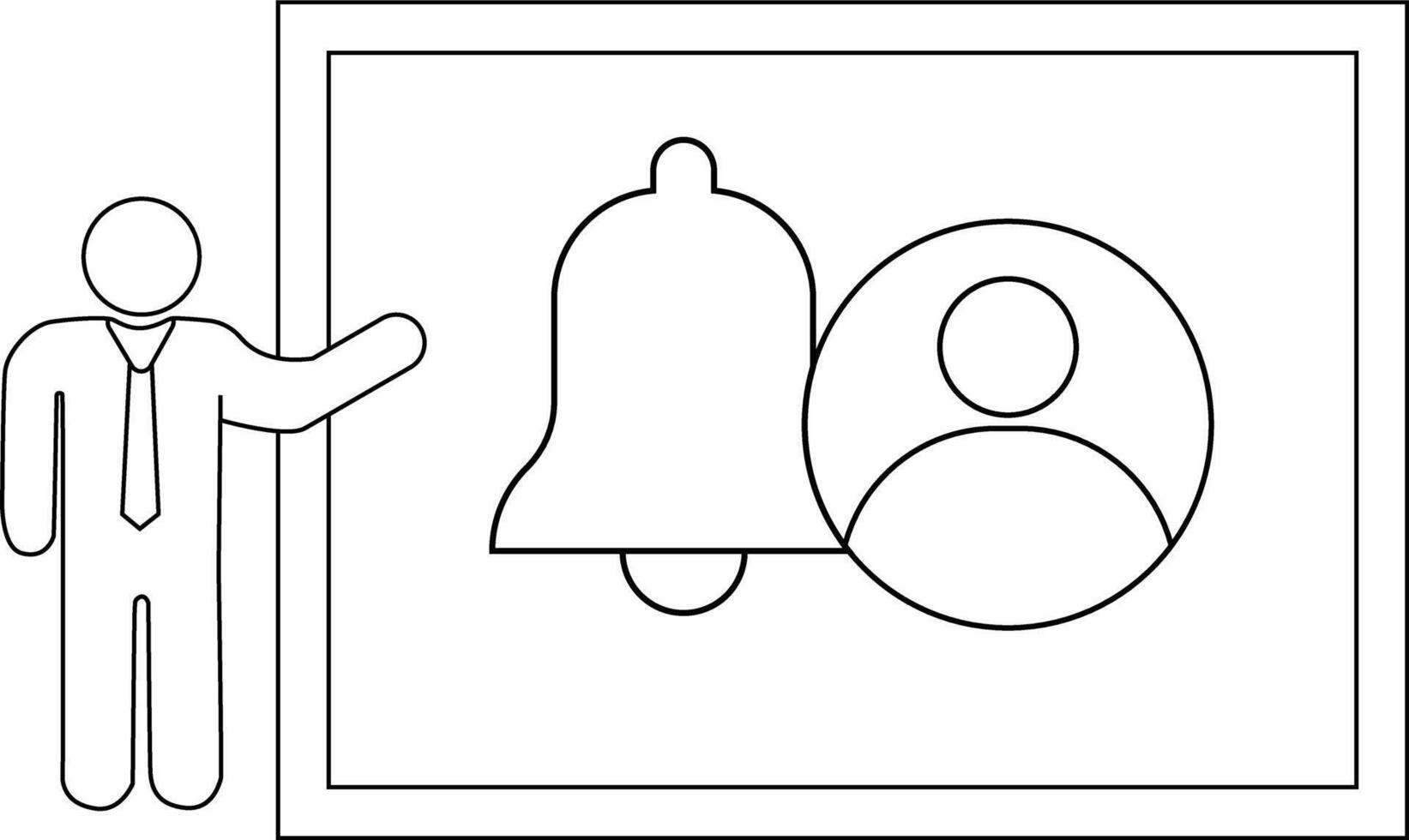 A stickfigure man presents a screen showing a bell and a person icon in a rectangular frame vector