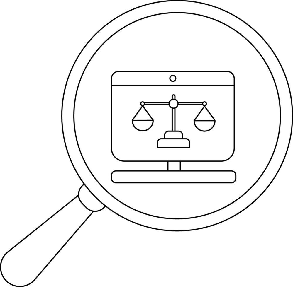 A magnifying glass reveals a computer monitor displaying a scale of justice vector