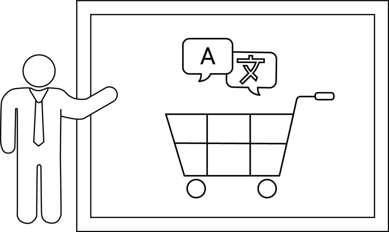 Man presenting a shopping cart displaying A and Chinese character in speech bubbles on a whiteboard vector