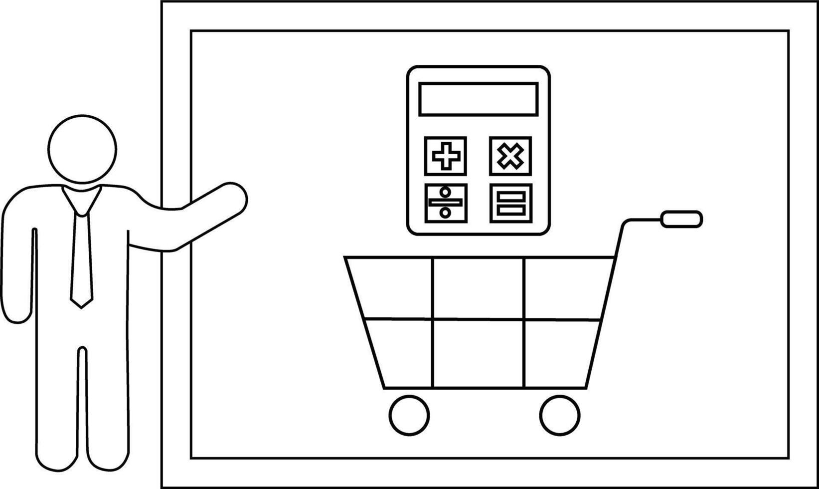 Stick figure presenting a shopping cart under a calculator within a framed display vector