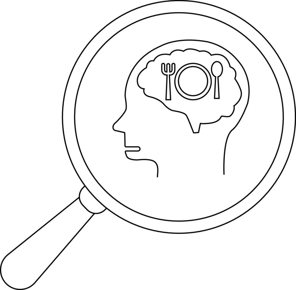 Outline of a head with a brain showing a plate fork and spoon all within a magnifying glass vector