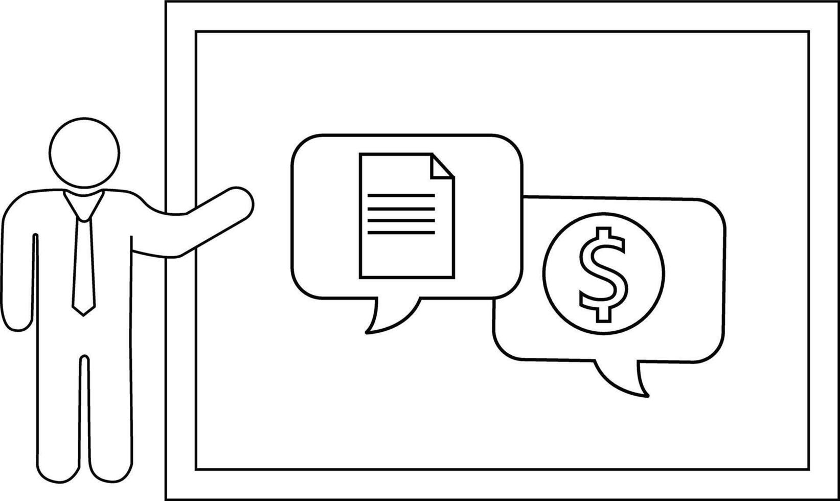 A presenter stands next to a screen showing a document and dollar sign in speech bubbles vector