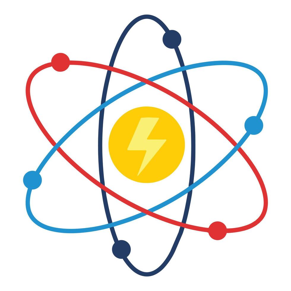 Abstract illustration of an atom with a lightning bolt symbolizing energy and power generation Pro Vector