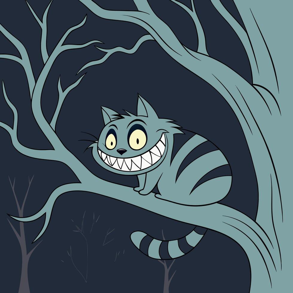 A terrifying depiction of the Cheshire Cat from Alice in Wonderland with glowing eyes and sharp Pro Vector