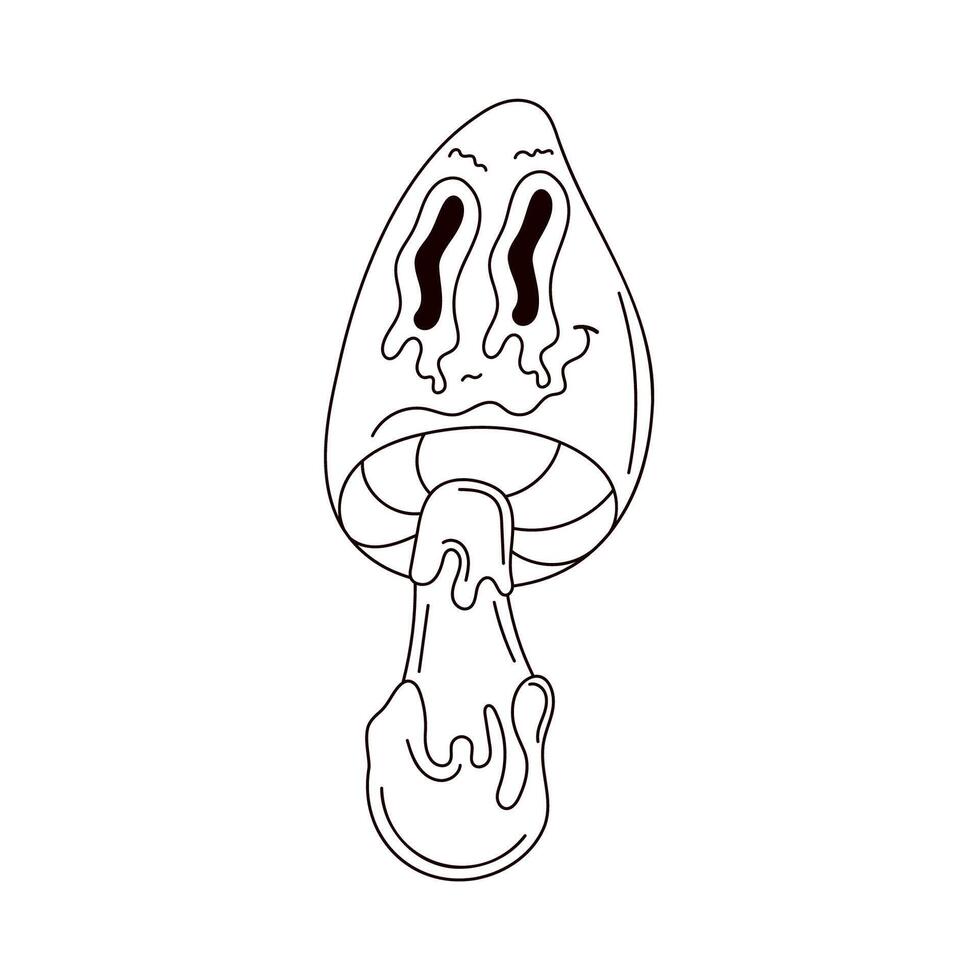Psychedelic mushroom in groovy line art style. Character with wide eyes and a crooked smile isolated on a white background. vector