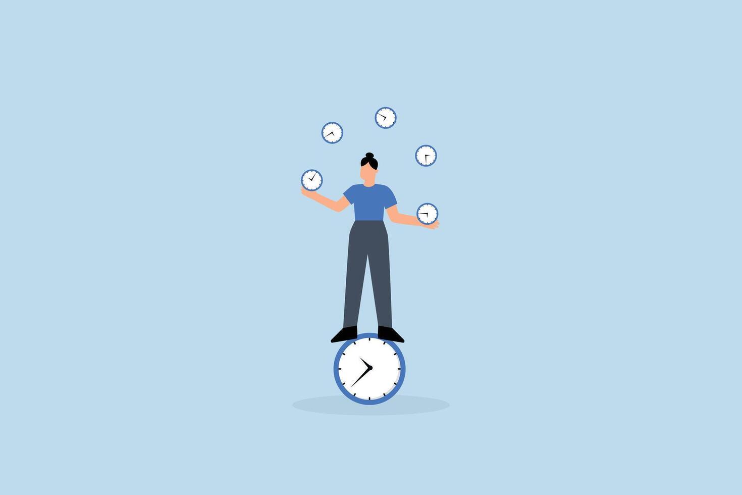 Time management for best efficiency and productivity, businesswoman balancing clocks while maintaining her own equilibrium on clock Pro Vector