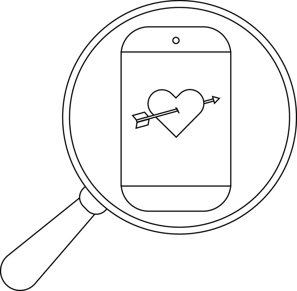 A magnifying glass focuses on a smartphone displaying a heart pierced by an arrow vector