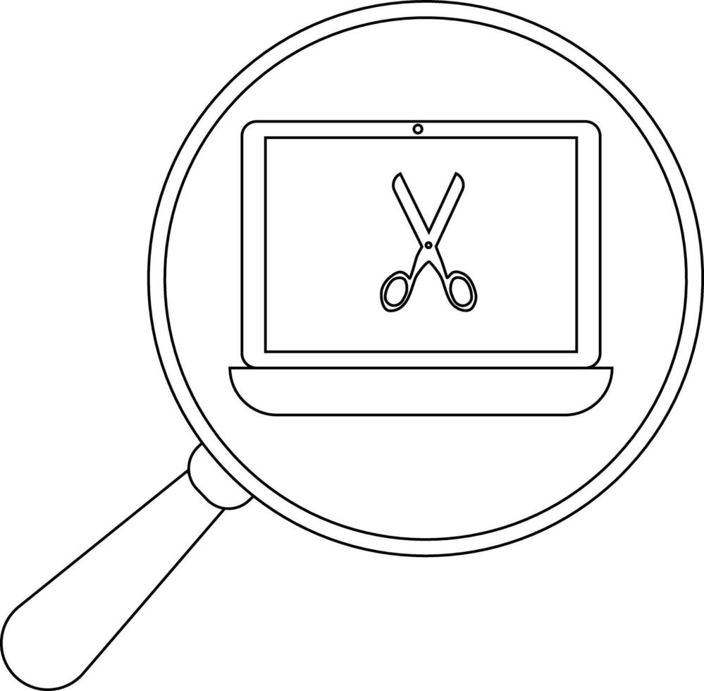 A magnifying glass focuses on a laptop screen displaying scissors suggesting a search for editing capabilities vector