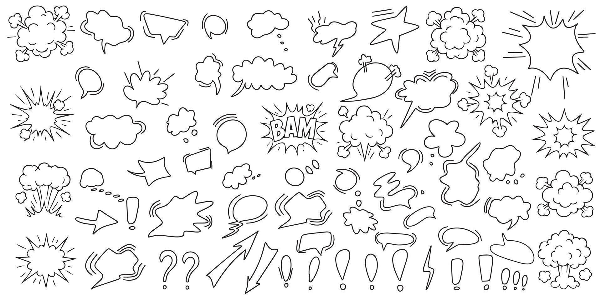 A huge set of dialog boxes, various hand-drawn options. A collection of speech bubbles for dialogue, doodle-style design on a white background. . Pro Vector