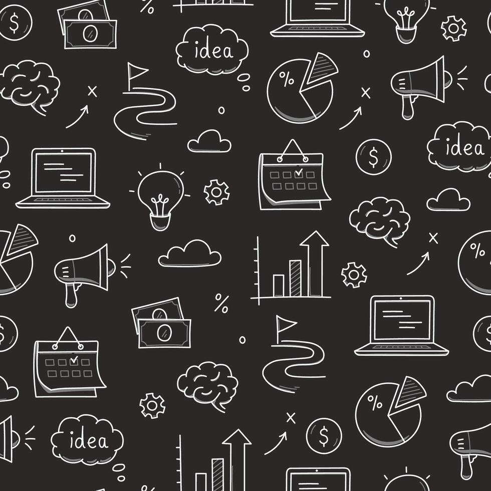 Business idea doodle line seamless pattern background. Business success, creative idea concept doodle drawn sketch style pattern with lightbulb, megaphone, calendar element. Pro Vector