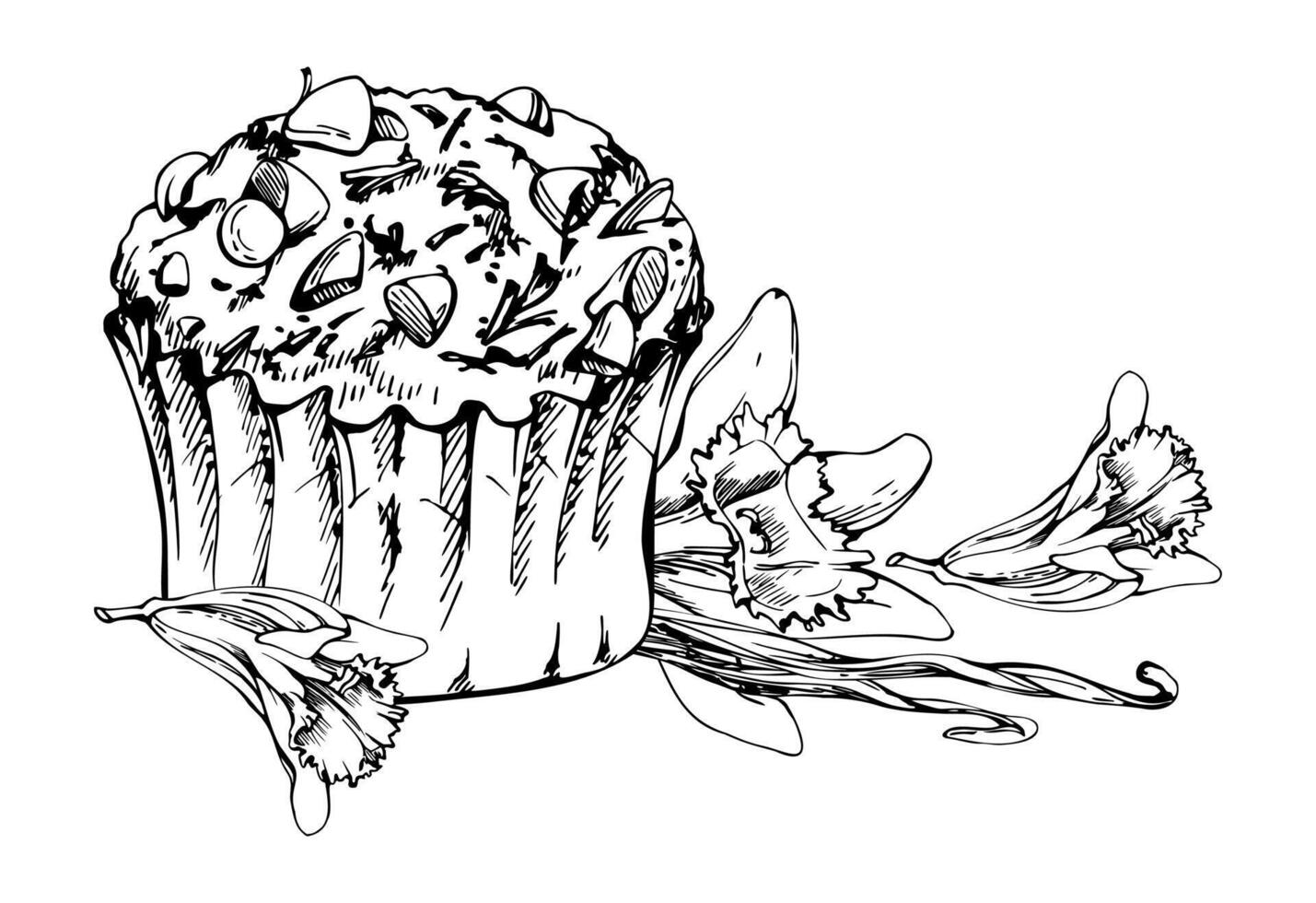 ink cupcake with chocolate frosting, muffin in paper liner topped with cocoa nibs, vanilla blossoms, seed pods. Isolated hand drawn element. Sweet menu, packaging, blog illustration graphics. Pro Vector