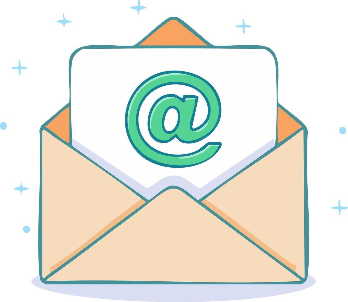 Hand drawn email concept with at symbol in an open mail envelope Pro Vector