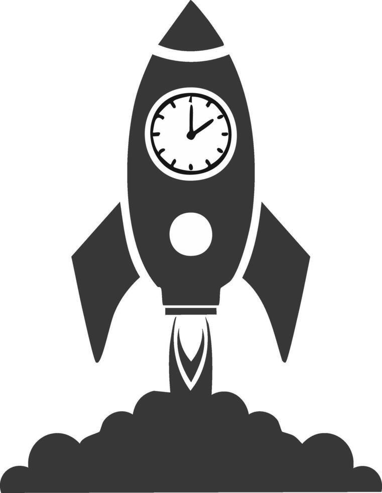 Rocket ship icon taking off with a clock face, representing time, deadlines and success, launch Pro Vector